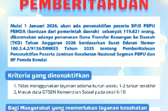 Walau berat musti kami sampaikan, bahwa oleh adanya keterbatasan anggaran sebagai dampak berkurangnya tranfer anggaran dari Pemerintah Pusat ke Daerah, mulai hari ini kartu JKN/KIS dari Pemda di non aktifkan, untuk masyarakat pemegang kartu JKN/KIS yang ditanggung PEMDA yang mempunyai penyakit kronis dan memerlukan perawatan dan penanganan serius untuk mengganti dengan BPJS Kesehatan Mandiri.